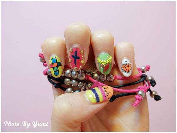 左手每根手指顏色都不同 鑽石和十字架都好特別 螢光色讓每根手指都特別耀眼
