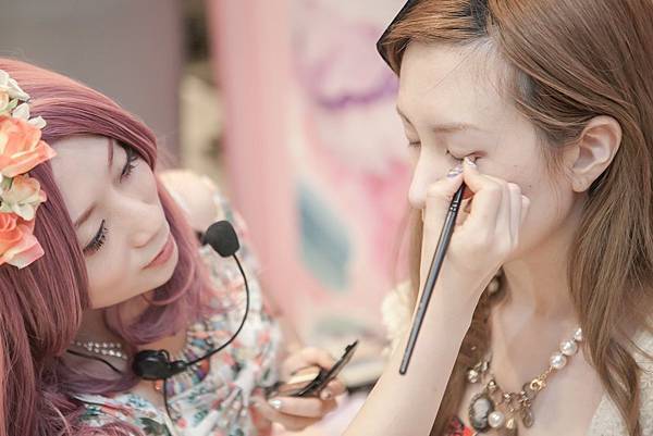 先幫她畫上橘色+粉紅的眼影混合腮紅 讓眼影顏色更特別