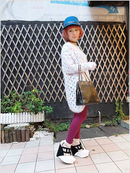 搭配紫色褲襪和條文貓咪鞋更是加分 不一定只能搭高跟鞋才能穿出時尚