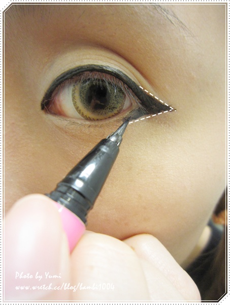 畫在上眼線的眼尾向上延展45度 呈現一個倒三角